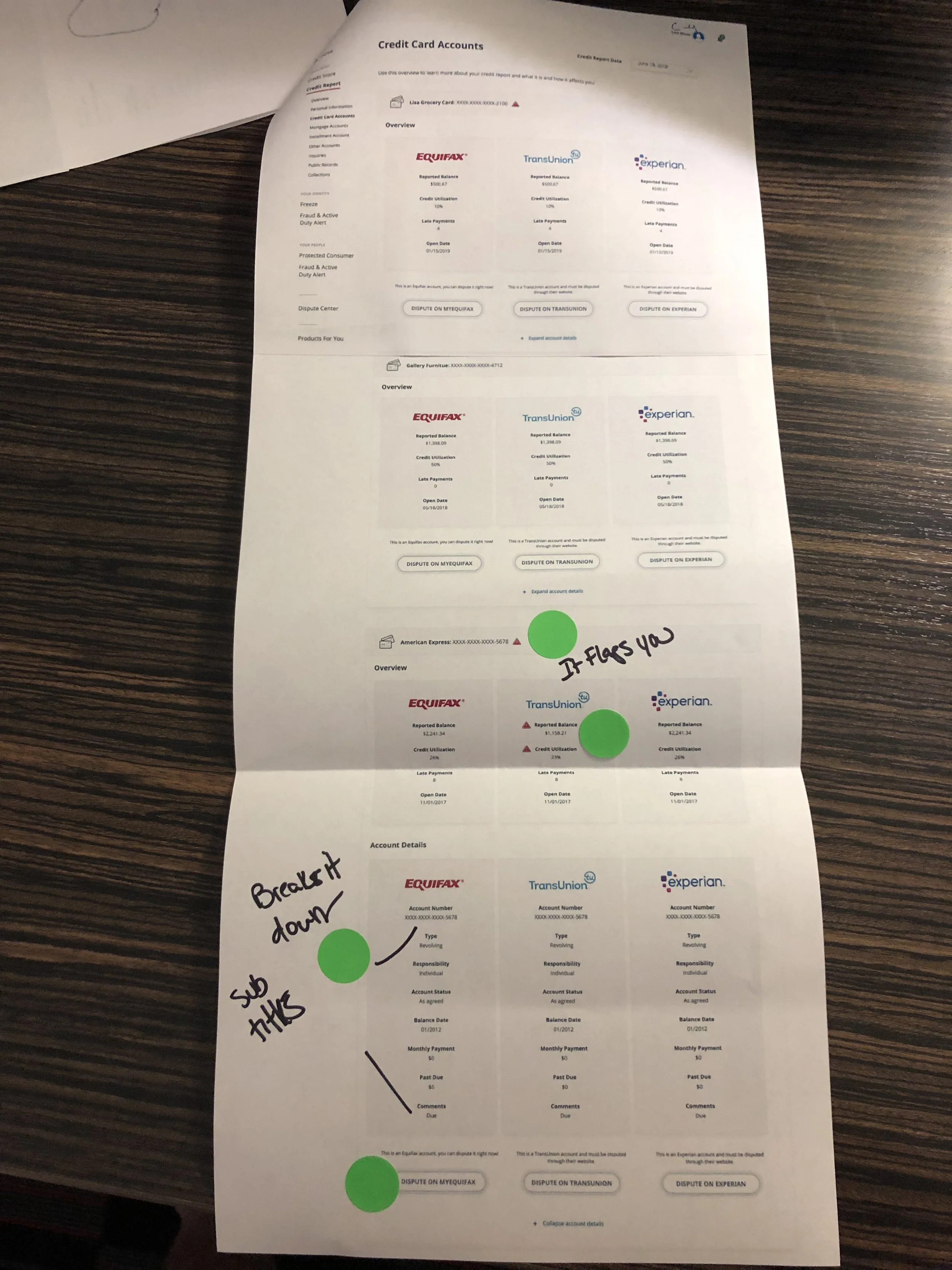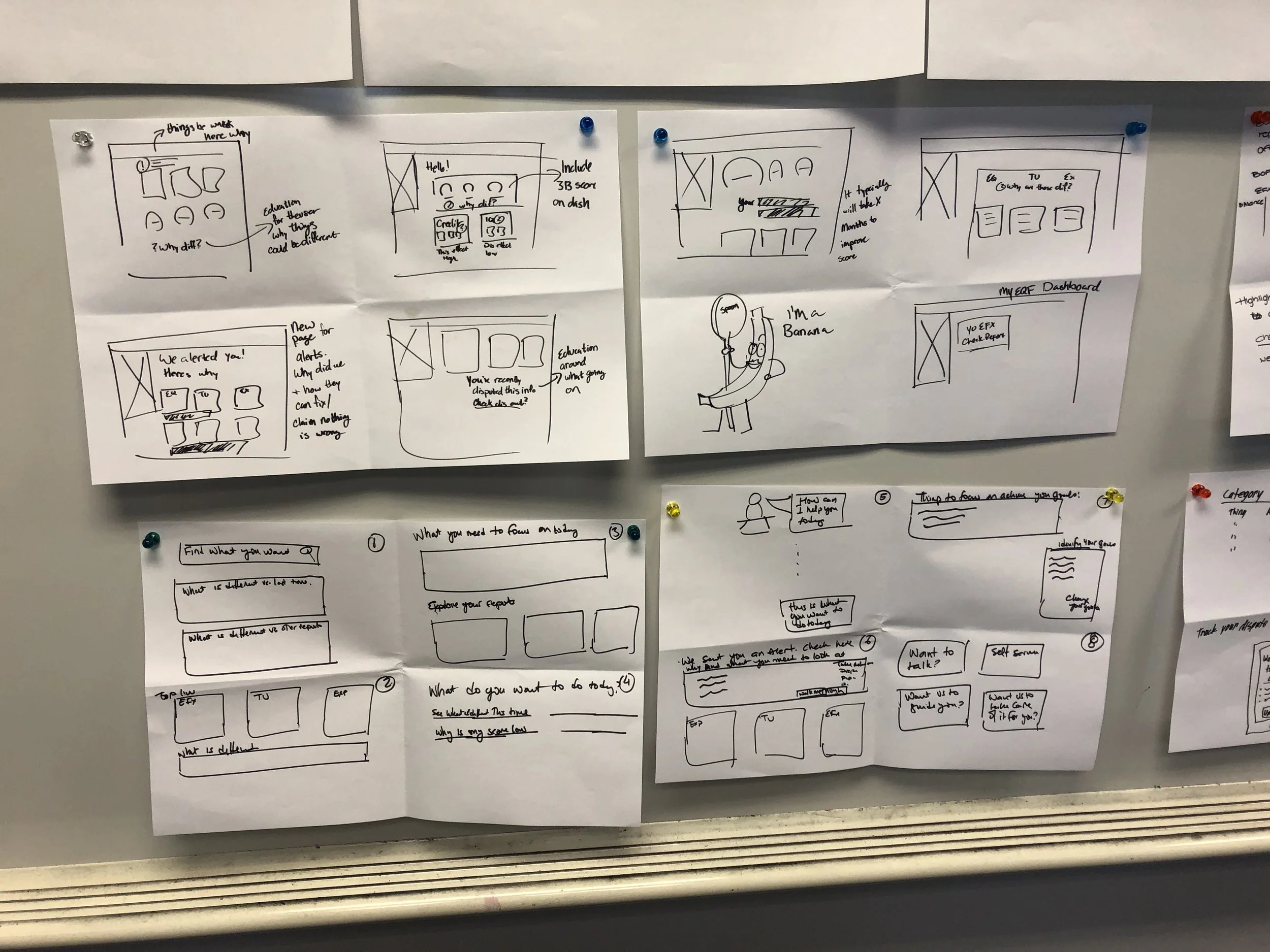 Armed with this hierarchy, we put pen to paper (and so did our client partners) to start coming up with page layouts, component ideas, and visual metaphors. We needed to make sure that all of the data was available and transparent. But we also needed to ensure that it couldn’t overwhelm. We saw using this credit report as an exercise in playing detective, and we needed to provide a visual “scent” of where people should go. Through multiple rounds of critique, debate, and co-learning, we crafted a pair of concepts to let real consumers tear apart.